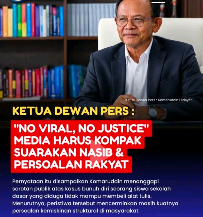 JAKARTA Sahabatkrisna.com – Ketua Dewan Pers menegaskan pentingnya peran media dalam mengawal keadilan sosial di tengah derasnya arus informasi digital. Ia menyoroti fenomena yang kian marak di masyarakat, yakni munculnya anggapan bahwa suatu persoalan baru mendapat perhatian ketika viral di media sosial.